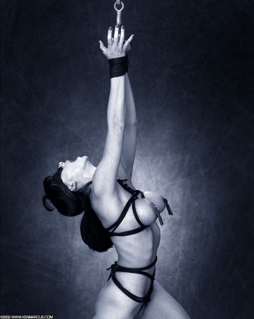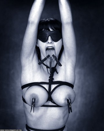 Страстная женщина в чёрном – любительница болезненного бонджа, отдалась в руки своего мучителя. Сладкие пытки начались со связывания и растяжек на подъемном кране. Прищепками парень защемил её соски и половые губы, а потом подвесил за руки и начал сильно шлёпать. Мужик одел даме повязку на глаза и повесил больные прищепки на язык. Сладкая боль пронзила тело девушки и бдсм наслаждение приняло другой оборот – наслаждение болью и кайф от наказания.