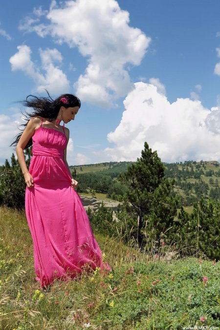 Яркий цветочек на фоне бесконечных гор - Ясми и фотосет «Выше неба», девушки в платье на природе (88 фото)